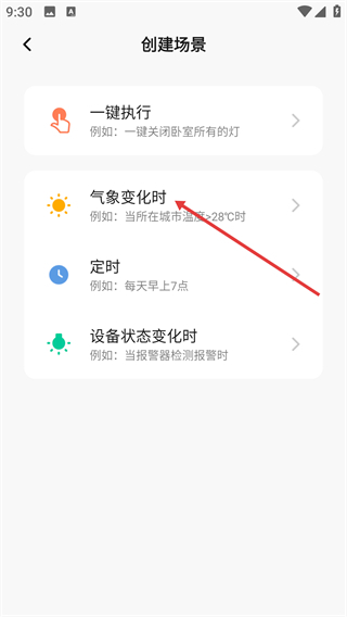 2、在创建场景页面选择【气象变化时】类型,进入该类型的场景配置界面。