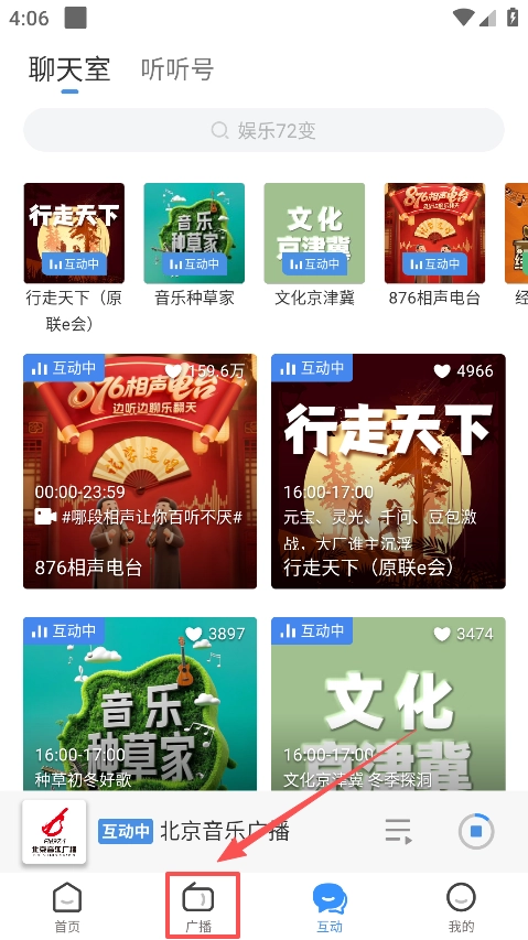 1、打开软件点击底部的广播