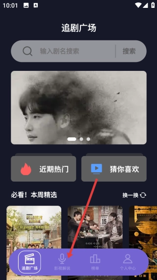 1、在追剧广场页面,点击底部的【影视解说】选项,即可进入影视解说的分类页面。