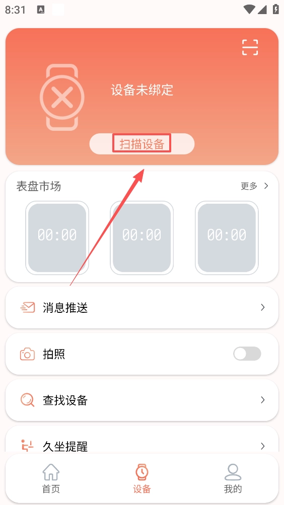 2.在设备管理界面开启手机蓝牙功能,点击扫描设备按钮搜索并绑定智能穿戴设备。