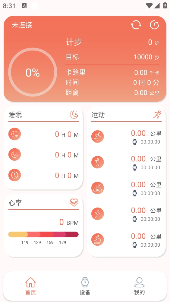 3.成功连接设备后,可在首页使用计步监测、睡眠分析、运动记录及心率检测功能。