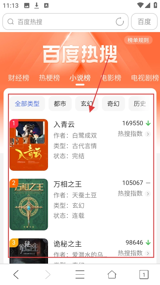 2、在小说页面的百度热搜小说榜中,找到目标小说,比如【入青云】,点击进入小说搜索结果页哦。
