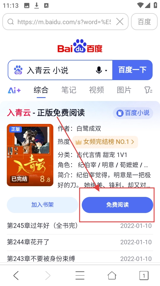 3、在搜索结果页,找到【入青云-正版免费阅读】条目,点击【免费阅读】按钮,进入小说阅读页面呢。