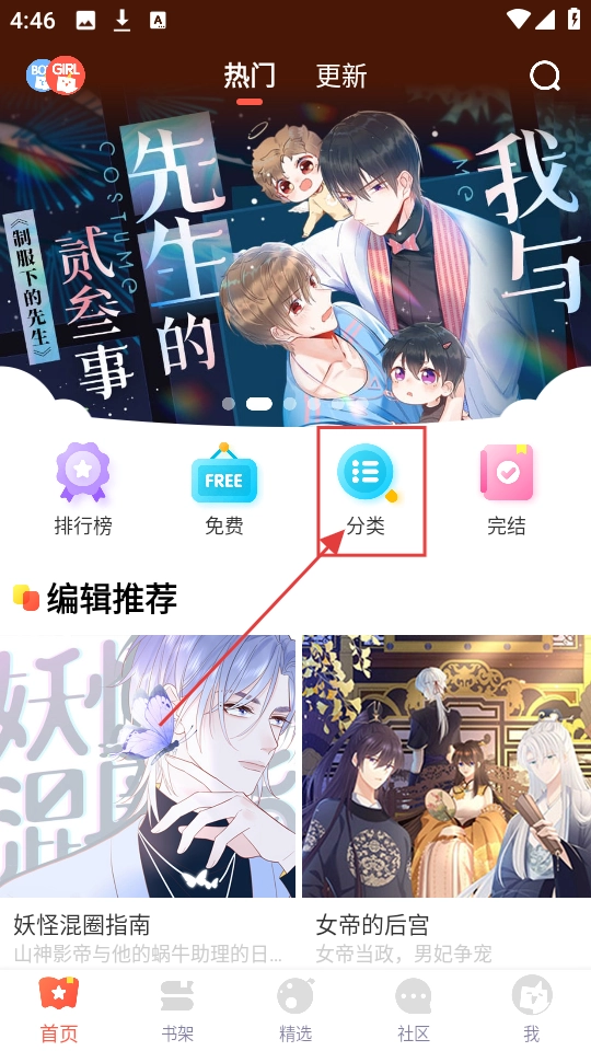 在软件首页,我们可以看到热门漫画推荐、排行榜以及免费等功能入口,点击【分类】按钮,即可进入漫画分类页面。