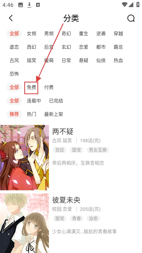 2、进入漫画分类页面后,我们可以选择“免费”分类,这样就能看到免费的漫画作品啦。