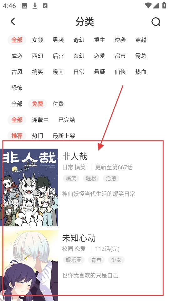3、在免费漫画列表中,有《非人哉》《未知心动》等漫画,我们点击感兴趣的漫画,就能进入该漫画的详情页面。