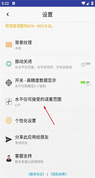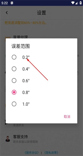 打开软件后进入设置页面,找到并点击“水平仪可接受的误差范围”选项,此时会弹出用于选择误差范围的操作弹窗。