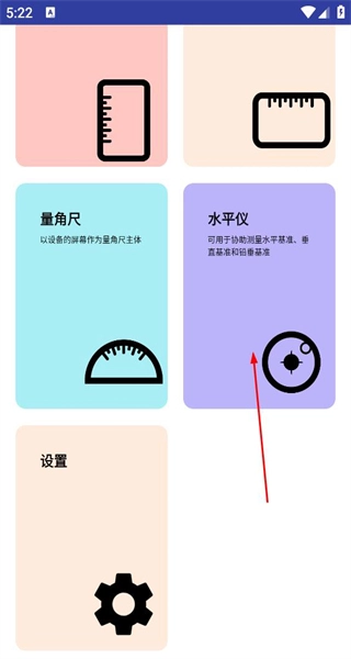 3、返回的功能页面,看到量角尺、水平仪等功能选项,点击水平仪选项,进入对应的水平仪测量操作界面。