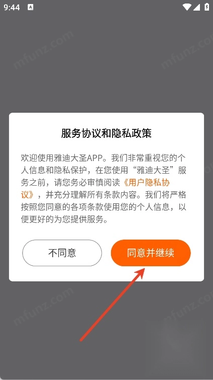 1、进入雅迪大圣后,选择“同意并继续”选项