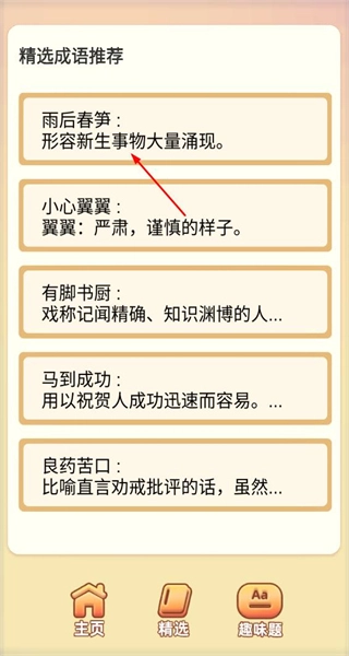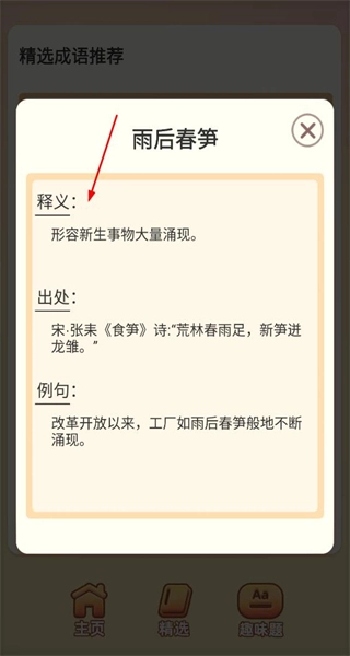 1、启动软件后,进入精选页面,能看到“雨后春笋”等推荐成语,点击“雨后春笋”,即可进入该成语的详情弹窗页面。