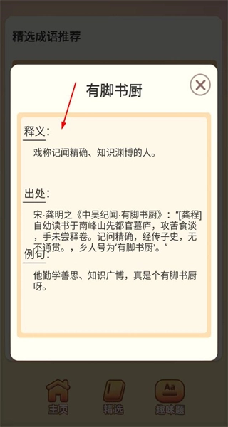 4、再次返回精选页面,点击有脚书厨成语,进入详情弹窗,查看该成语的释义出处等相关信息。