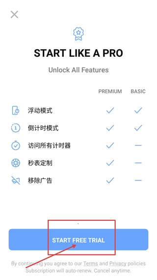 1、在功能解锁界面,点击【START-FREE-TRIAL】按钮,即可开启免费试用,解锁【访问所有计时器】【秒表定制】等PRO版功能。