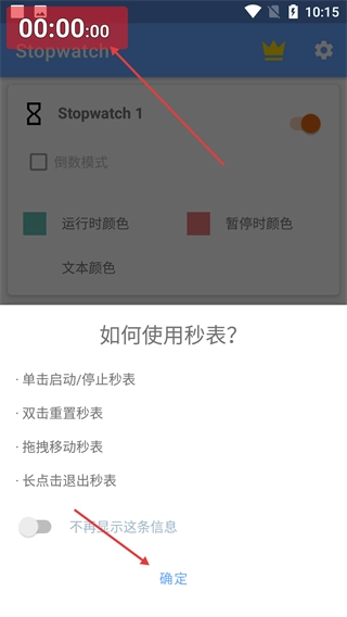 3、启用秒表后,会弹出使用说明弹窗,介绍单击启停、双击重置等操作方式,点击【确定】即可关闭弹窗并使用秒表。