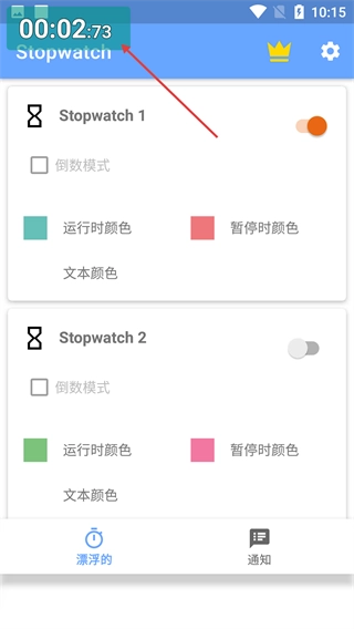 4、启用【Stopwatch-1】后,界面上方会显示计时进度(如【00:02:73】),可通过开关控制秒表启停,同时支持调整颜色等配置。
