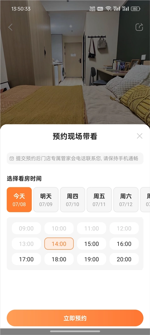 3、选择好看房时间后点击立即预约。最后耐心等待联系电话即可。