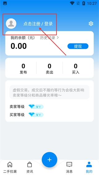 2、进入【我的】页面后,点击顶部的【点击注册/登录】区域,可进入登录流程,完成后可使用余额、交易等功能。