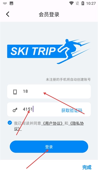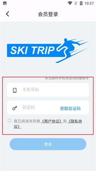 4、在【会员登录】页面,填好手机号与验证码、勾选协议后,点击【登录】按钮,即可完成账号登录,未注册手机会自动创建账号。