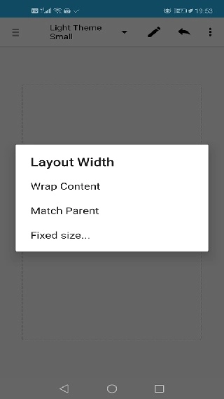 6. 将两个小线性布局的宽度调整为屏幕宽度。点击小正方形虚线框,找到“Layout Width = Wrap Content”这一项,点击后弹出窗口。