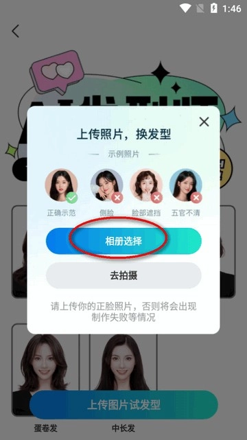 2、如ai换发型的功能,选择上传图片试发型。