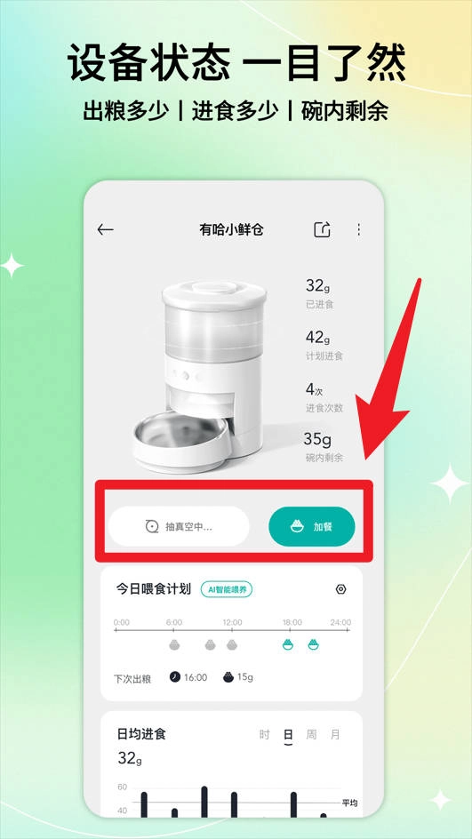 2、在设备控制页中可以直接查看设备当前状态,并一键进行加餐操作。