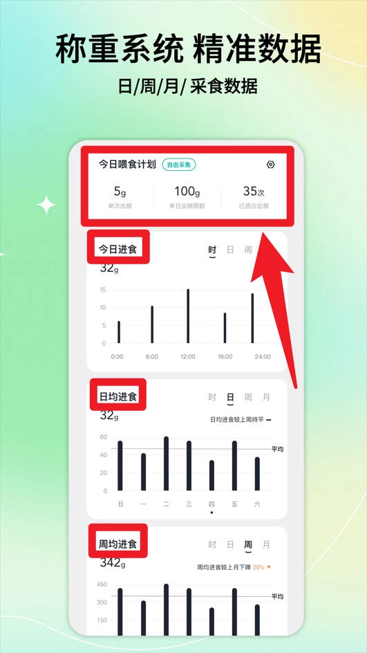 3、页面显示宠物每日进食计划与喂食次数,搭配图表可清晰掌握各时段进食量,便于主人科学调整宠物饮食。