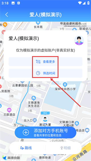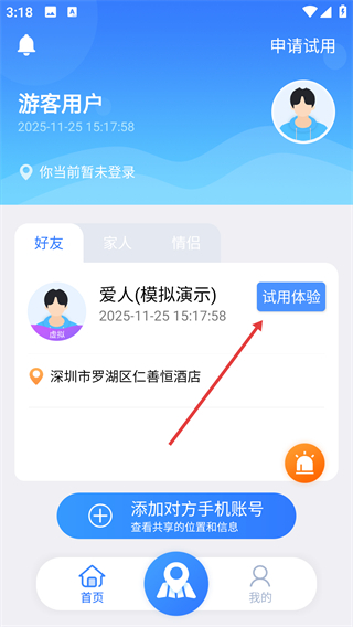 1、在主界面找到目标用户,点击其旁边的【试用体验】按钮,即可进入该用户的位置共享详情页面。