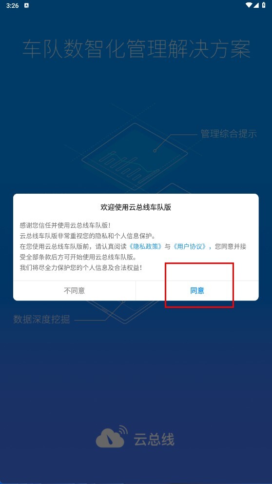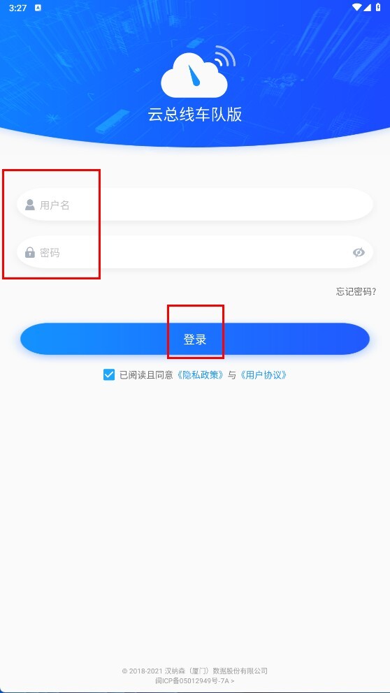 3、在登录页,填写【用户名】与【密码】,确认已勾选协议后点击【登录】,进入云总线车队版系统。