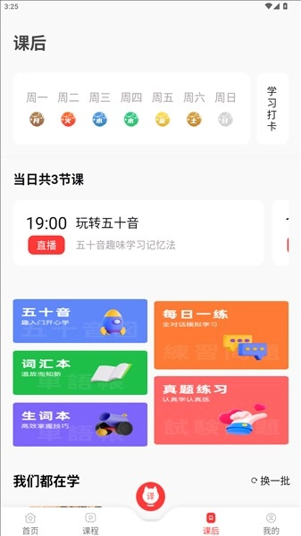 4、课后页面可以对用户的日语学习进行题目训练或者单词记忆等等巩固操作。