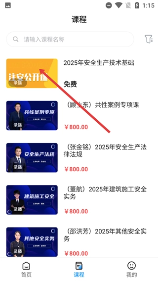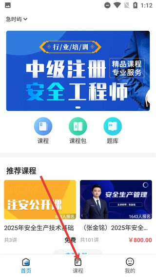1、打开中级注册安全工程师培训的首页后,点击底部导航栏中的【课程】选项,即可进入课程列表页面。