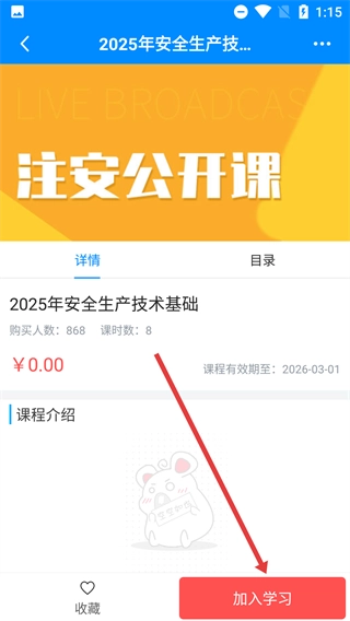 3、在课程详情页,查看课程介绍、有效期等信息后,点击【加入学习】按钮,进入课程目录界面。