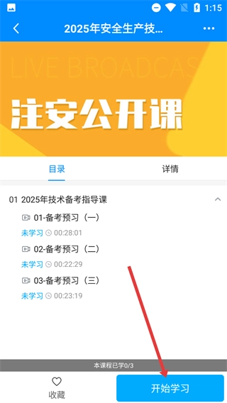 2、在课程列表页面,选择目标课程(如《2025年安全生产技术基础》),进入该课程的详情页面。