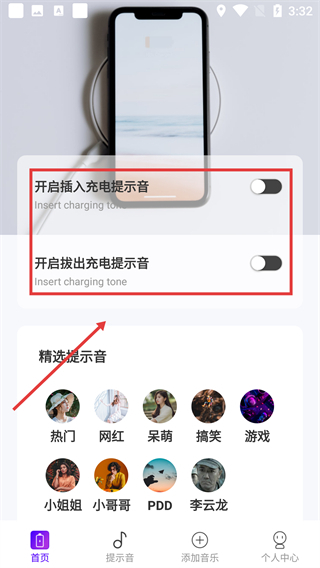1、在主界面找到【开启插入充电提示音】和【开启拔出充电提示音】的开关,目前这两个开关都处于关闭状态,可以准备开启。