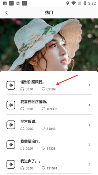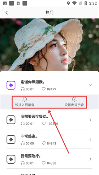 3、选择【热门】分类下的提示音内容(如“谢谢你照顾我”),进入该提示音的设置界面。