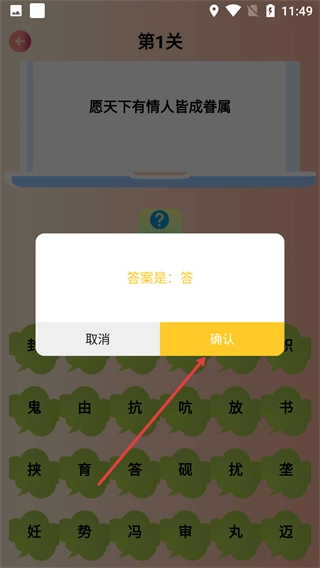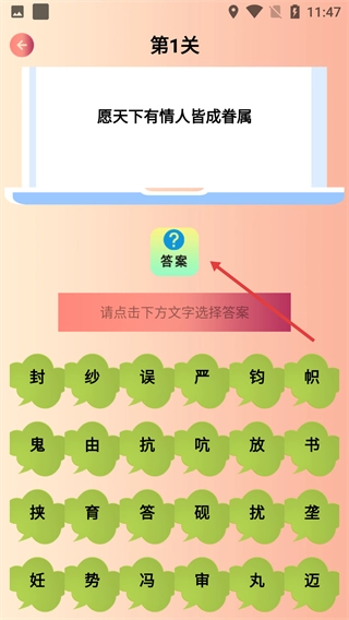 3、在猜字谜关卡中,根据题目提示,点击下方文字选择答案;也可点击【答案】按钮查看正确选项。