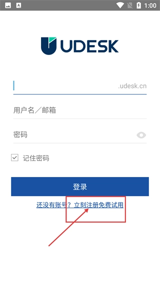 2、进入【UDESK】的登录页,若没有账号,可点击【还没有账号?-立刻注册免费试用】选项,开启注册流程。
