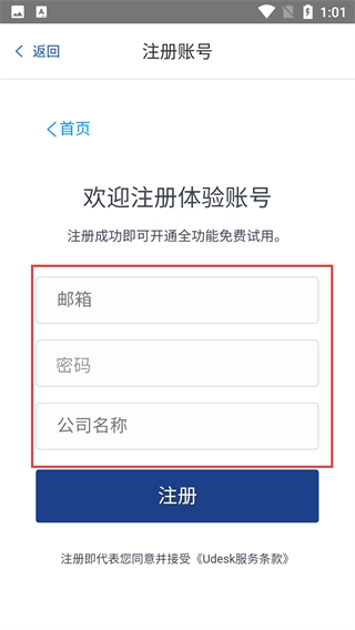 4、完成验证后,填写【邮箱】-【密码】-【公司名称】,点击【注册】即可开通【UDESK】全功能免费试用。