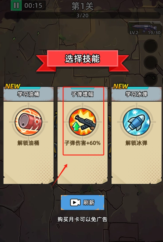 2.点击屏幕射击僵尸,积累经验值提升等级,解锁肉鸽属性