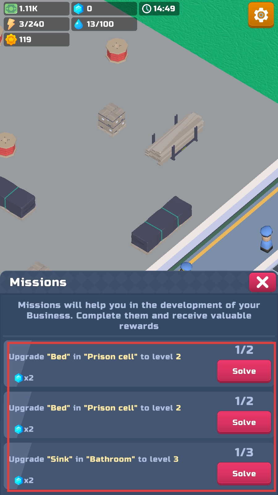 4、查看任务栏,完成【升级牢房床铺】等任务,点击【Solve】领取奖励,助力监狱帝国发展呀。