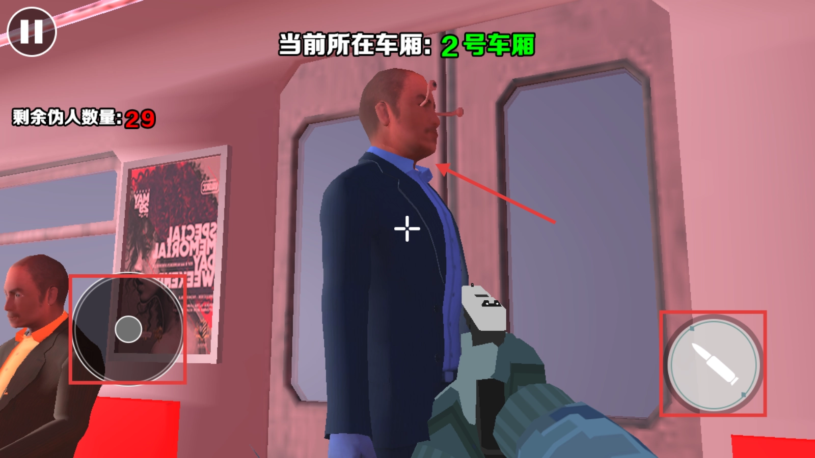 3、推进至【2号车厢】,点击右侧射击按键,精准攻击伪人,降低【剩余伪人数量-29】呢。