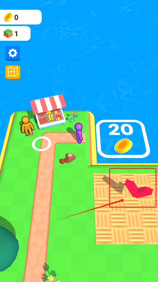3、让紫色小人走到摊位前,完成交易能赚20金币,现在金币是0。