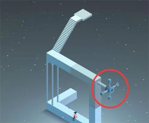 5、因为我在玩这个游戏的时候,在这个地方我也是思考了几分钟,这里看似是无路可走了,但是标记的地方是一个楼梯,那么我们点击一下楼梯下面的道路,我们就可以下去了。下去之后我们让齿轮机关向左滑动,使人物可以顺利通过前方道路,进入最顶端的门口时就可以进入下一关了。