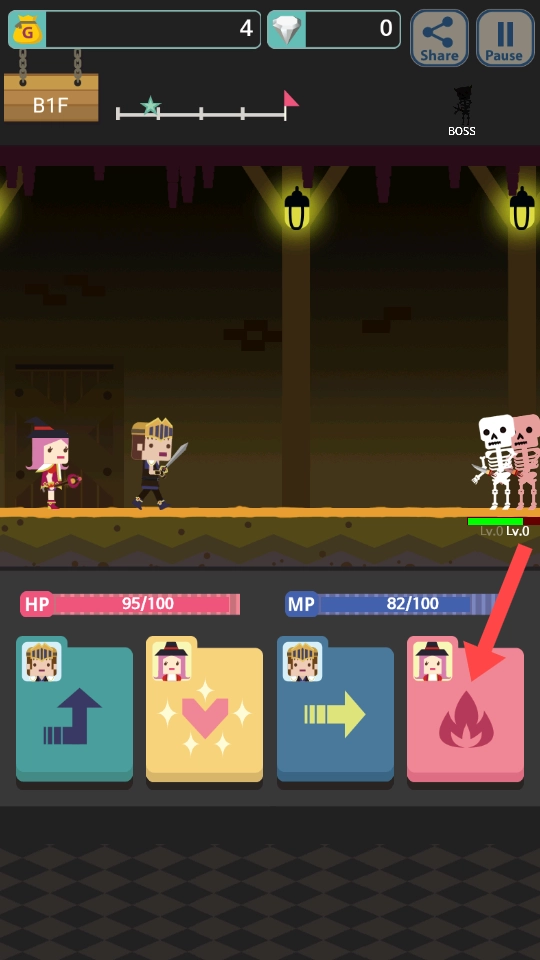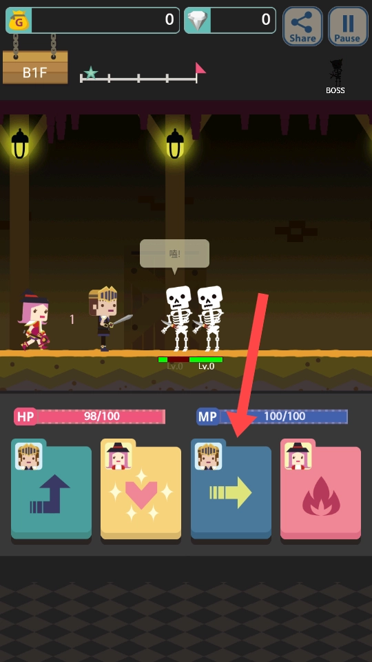 4、面对如箭头所指的【BOSS】时,灵活运用下方技能按钮,合理分配【HP】和【MP】资源,确保角色生存并击败敌人。