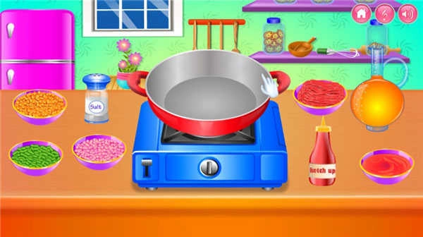 2、点击食材,它们会落在砧板上,点击刀具并对齐食材以完成切割动作。烹饪过程也是如此,点击开火或关火
