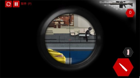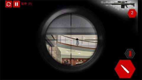 第6关:等目标处于两扇玻璃门之间再开枪,注意不能误击玻璃,避免阳台上的保安察觉。