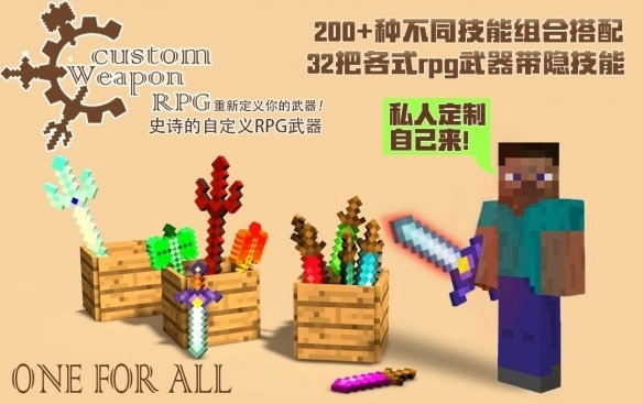 万事为器,万物为兵。《史诗的自定义RPG武器》组件拥有强悍的自定义功能,冒险家在创造模式下通过“自定义武器制作机”将任意物品设置任意攻击属性,并制作成武器,还可以通过“武器萃取机”把无用武器萃取成能量来强化新武器。在生存模式和其他模式下,冒险家可以获得怪物身上随机掉落的RPG装备。本组件更新增32把不同的武器,让冒险家根据自己的想法,定义自己的游戏世界。