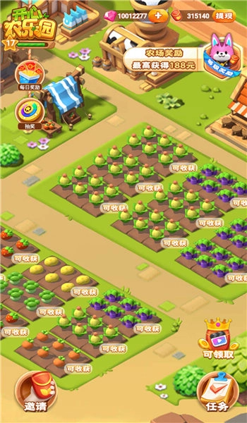 开心农乐园红包版是一款以农场种植为题材的模拟类手机游戏。在游戏里,你能拥有专属的农场,在这片土地上种植各式各样的蔬菜与农作物。玩家在开心农乐园红包版中能够获取红包奖励,既可以通过抽奖随机抽取红包,也能从日常奖励里领取红包,同时还能凭借种植和收获农作物来赢得免费红包。赶紧来体验一下吧。