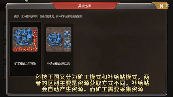 3、科技王国又分为矿工模式和补给站模式,两者的区别主要是资源获取方式不同,补给站会自动产生资源,而矿工需要采集资源