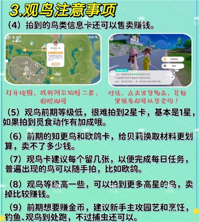 (11)前期想要赚金币,不建议用观鸟,可以通过园艺和烹饪赚钱,捕虫也不错,虫比鸟卡值钱一些。