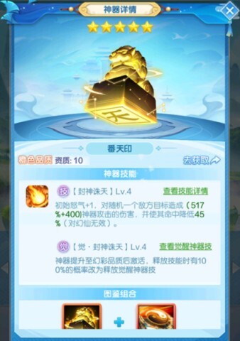 2、番天印:橙色神器,以攻击为主,觉醒后能大幅提升伤害,并降低敌方命中率。