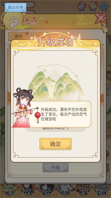 10、升级成功,瀑布不仅外观发生了变化,每次产出的灵气也增加啦;